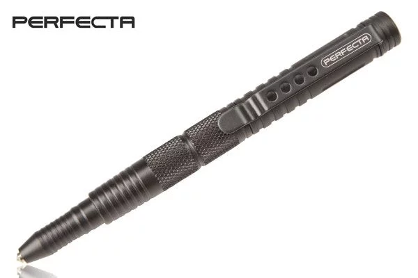 Długopis Perfecta TP IV to taktyczny gadżet codziennego użytku. Długopis ten wykonano ze wzmacnianego aluminium, dzięki czemu jest on praktycznie "niezniszczalny" w codziennym zastosowaniu. Antypoślizgowa faktura aluminium zapewnia wygodny i pewny chwyt pisania jak również w trakcie awaryjnego użycia. Długopis wyposażono w stalowy zbijak do szyb, pełniący awaryjnie również funkcję kubotanu do samoobrony.