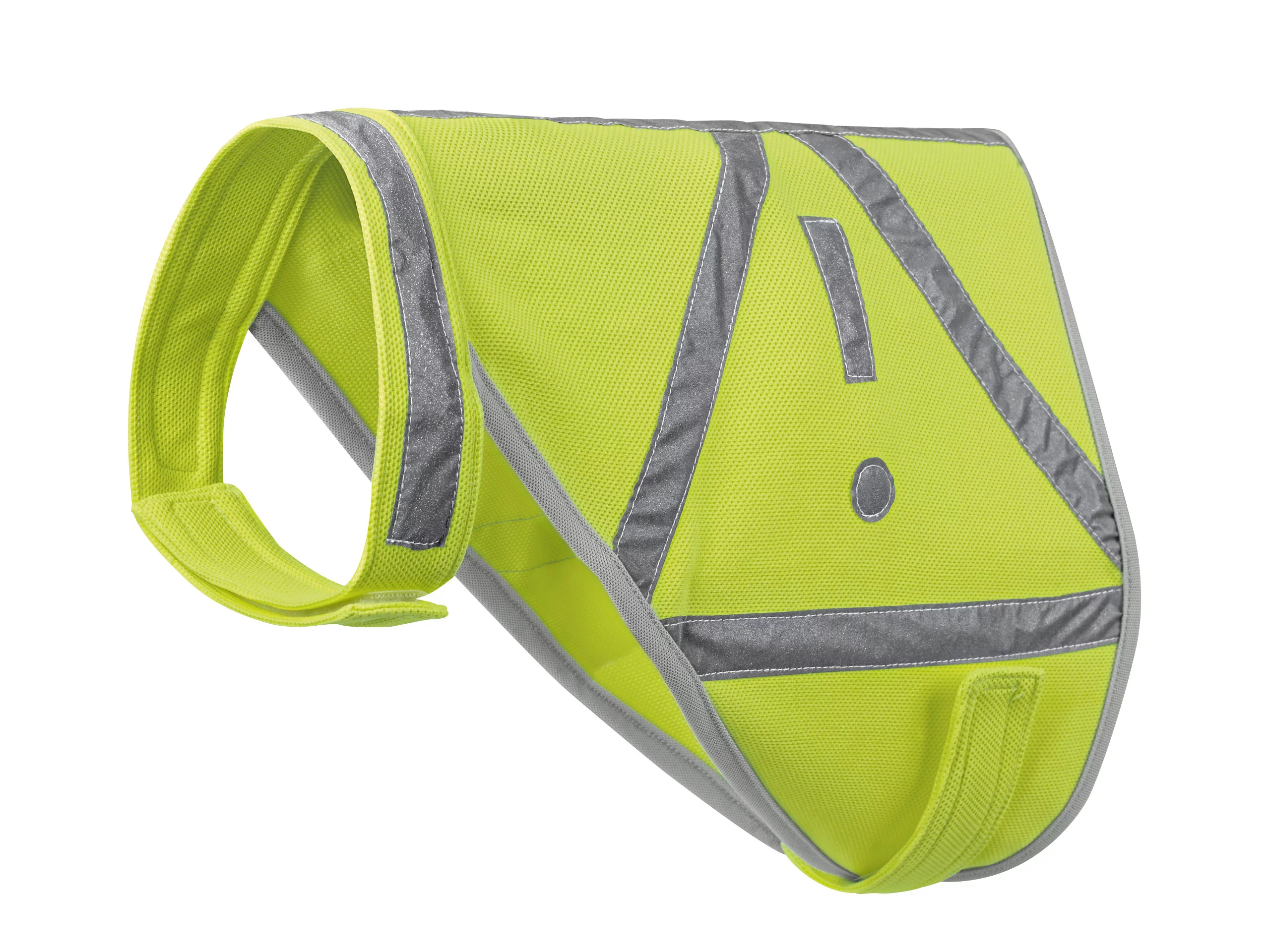Kamizelka ma jaskrawą kolorystykę oraz odblaskowe wstawki, dzięki którym zwierzę jest z daleka widziane przez kierowców, przechodniów oraz innych właścicieli psów.