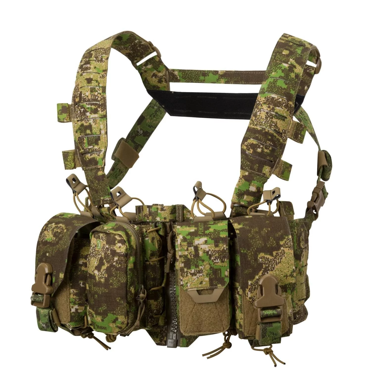 HURRICANE® hybrid chest rig Podobnie jak w trakcie Bitwy o Anglię, nasz HURRICANE® jest koniem pociągowym całej linii. Ten rozpinany z przodu , hybrydowy, częściowo modułowy chest rig, posiada naszyte na stałe wewnętrzne kieszenie na magazynki. Dzięki zwartej konstrukcji, oraz przesunięciu kieszeni możliwie blisko centralnego zamka, pozwala na wygodne noszenie go samodzielnie, a po zamontowaniu do plate carriera sprawia, że całe wyposażenie znajduje się zawsze pod ręką. Cechy: -Wykonany z laminatu, Cordury® 500D oraz soft-shella -Zintegrowane ładownice na magazynki mogące pomieścić: 8 magazynków do systemu AR, 4 magazynki do systemu AK lub 4 do systemu SR -Naszyte na stałe kieszenie zewnętrzne: dwie ciche, w pełni regulowane, jedną na zamek błyskawiczny oraz jedną zamykaną na Velcro® umożliwiającą szybki dostęp do zawartości. -Płaskie kieszenie wewnętrzne w każdym panelu -Płaskie, w pełni regulowane szelki z uchwytami na PTT oraz możliwością mocowania dodatkowego wyposażenia -Wzmocniony chwyt ewakuacyjny wkomponowany w konstrukcję szelek -Interface umożliwiający doczepienie za pomocą klamer do plate carriera -Uchwyty na przewody/antenę -PALS bo bokach na radiostację, apteczkę lub kieszeni uniewersalne; poziomy montaż PALS pod ładownicami przeznaczony na stazę, ładownice pistoletowe itp.100% Nylon