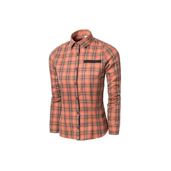 Wygodna koszula flanelowa w pomarańczową kratkę, o taliowanym kroju. Zmiękczona tkanina, trwała i miła w dotyku. Tkanina łączy zalety bawełny i poliestru.