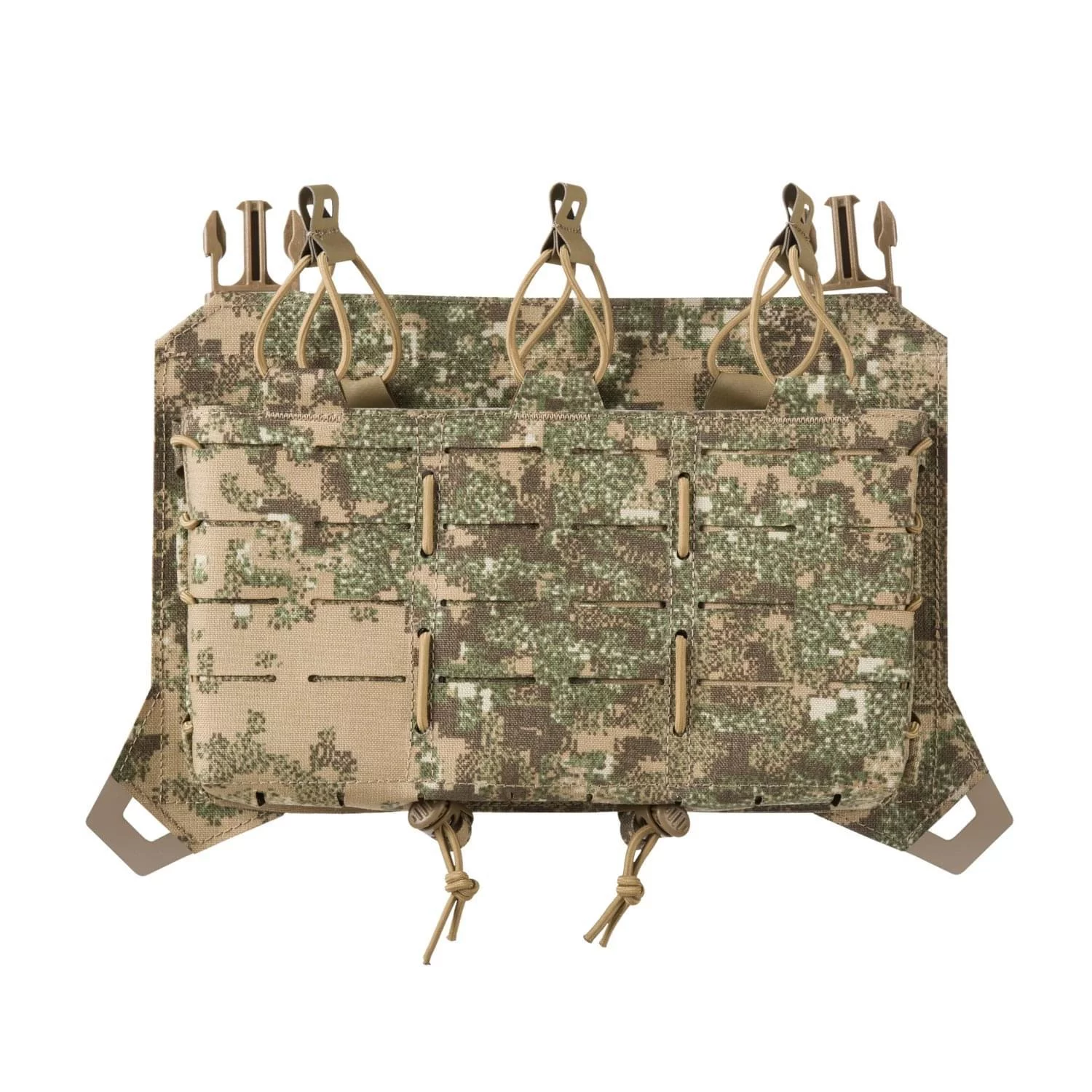 Kieszeń wyposażona jest w regulację wysokości oraz boczne ściany z elastycznych ściągaczy, dzięki czemu może pomieścić magazynek o różnej wielkości.Przednia powierzchnia kieszeni pokryta została laserowo ciętym systemem modułowym kompatybilnym z systemem mocowań MOLLE/PALS.