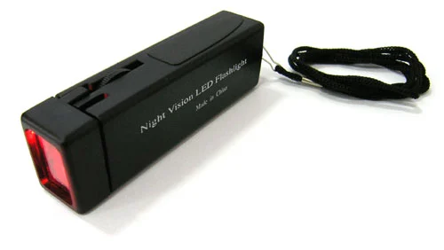 Latarka diodowa emitująca czerwone światło. Regulacja natężenia, zasilanie baterią 9V.