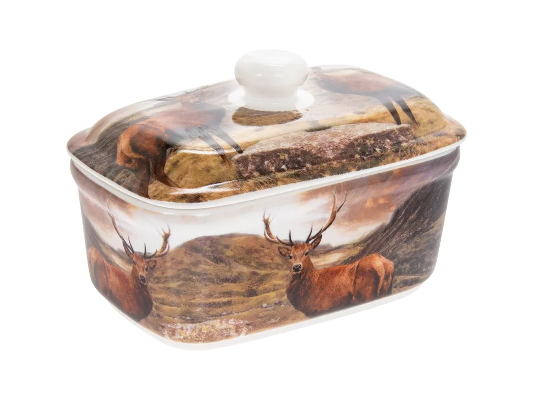 Ceramiczna maselniczka z pokrywką oraz zwierzęcą grafiką doskonale pasuje do rustykalnego i myśliwskiego wystroju wnętrz.