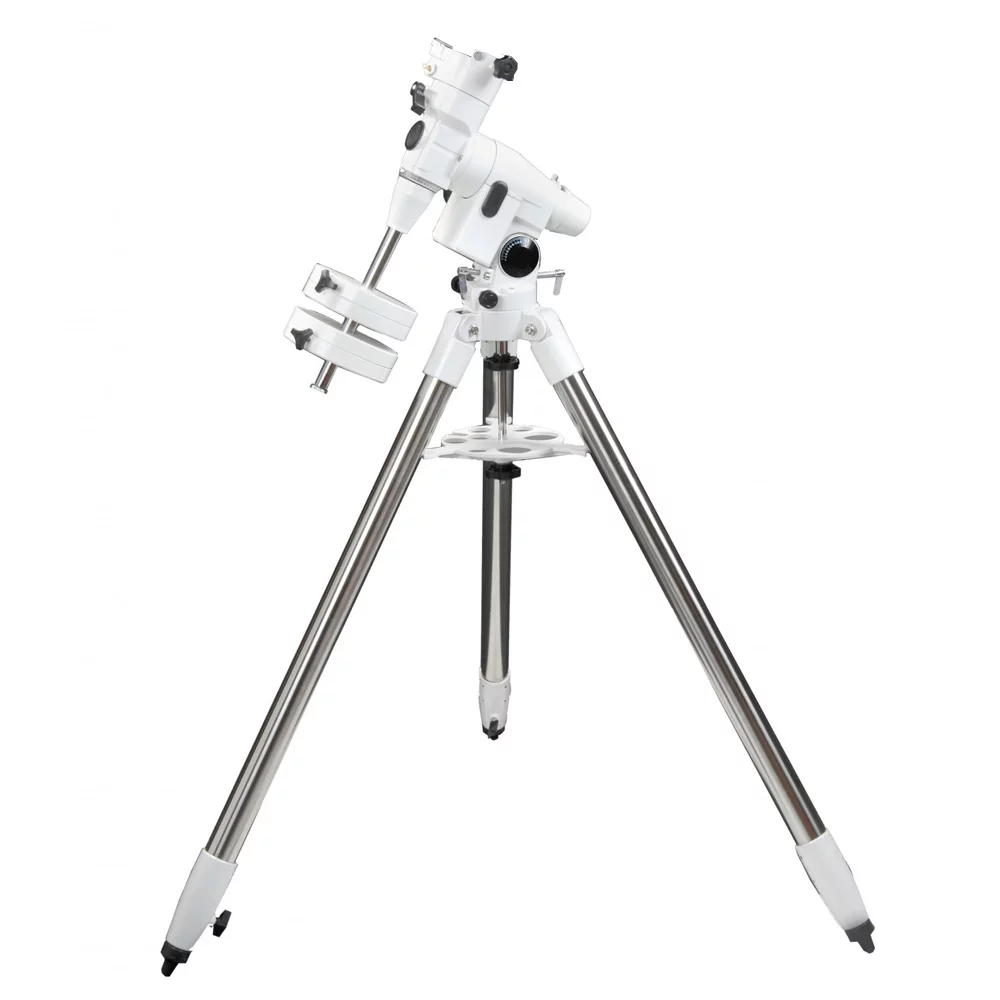 Montaż paralaktyczny EQ5 (CG-5) oferuje wyjątkową stabilność i precyzję wraz z wieloma innymi wysoko użytecznymi funkcjami, przydatnymi dla każdego, nawet zaawansowanego astronoma. Głowica montażu pewnie spoczywa na szerokiej platformie montażowej statywu wykonanego ze stali nierdzewnej i wyposażonego w użyteczny stolik na akcesoria. Komplet zawiera ponadto wskaźnik wypoziomowania (poziomicę), regulację ustawienia szerokości geograficznej wraz ze skalą mikrometryczną oraz azumutalny regulator nastawu lunetki biegunowej na gwiazdę polarną. EQ5 posiada również grawerowane aluminiowe pierścienie nastawcze oraz pokrętła mikroruchów. Montaż ma możliwość opcjonalnego wyposażenia zestawu w napęd w jednej lub obu osiach.