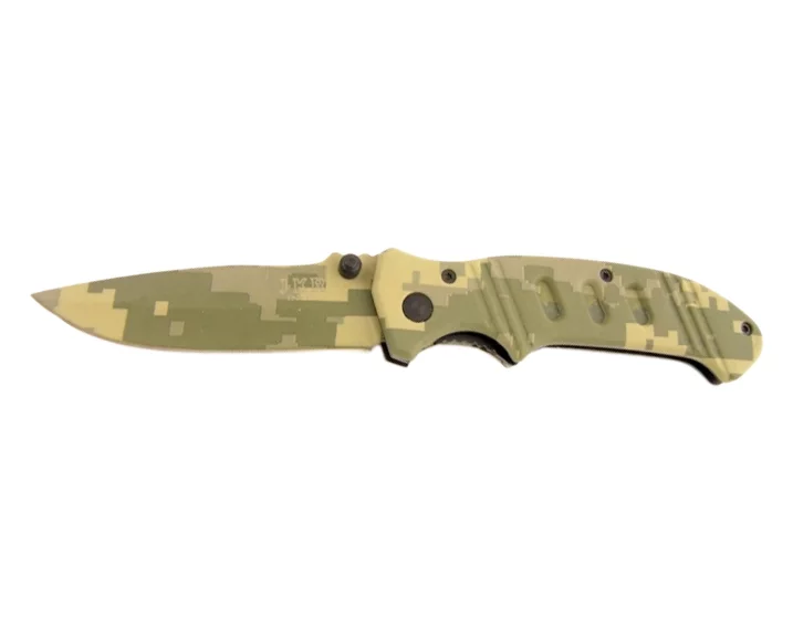 Jest on składany i w całości wykonany z mocnej stali nierdzewnej. Ostrze wykończone jest szlifem wklęsłym.