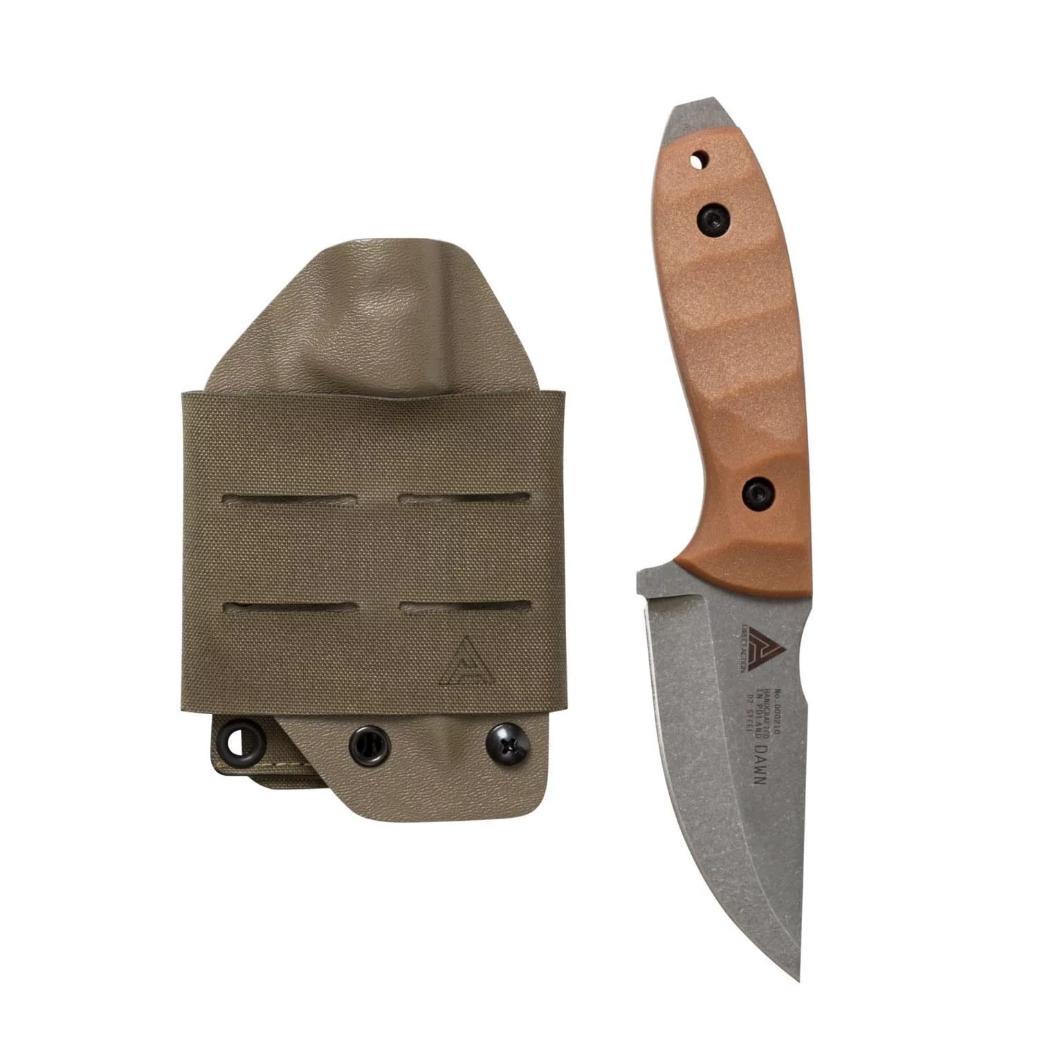 DAWN to kompaktowy nóż taktyczny, idealnie nadający się do montażu na plate carrierze, chest rigu lub szelce bojowej. Konstrukcja i materiały są identyczne jak w naszym dużym nożu DUSK.