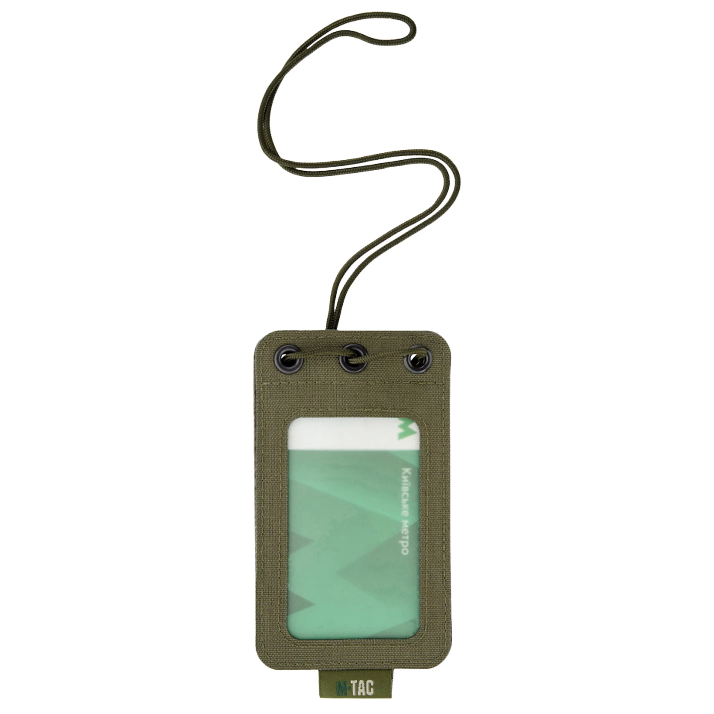 Pokrowiec M-Tac uszyto z wytrzymałej tkaniny nylonowej, odpornej na wilgoć i zanieczyszczenie. Przedni panel z przezroczystym okienkiem służy do przenoszenia dowodu osobistego, licencji strzeleckiej lub karty pracowniczej. Na tylnej ściance naszyto taśmę velcro (dwie warstwy haczyki i pętelki), dlatego pokrowiec można mocować do odzieży lub wyposażenia z panelem velcro, lub umieszczać na nim emblematy na rzep. W górnej części znajdują się zakute oczka na linkę.