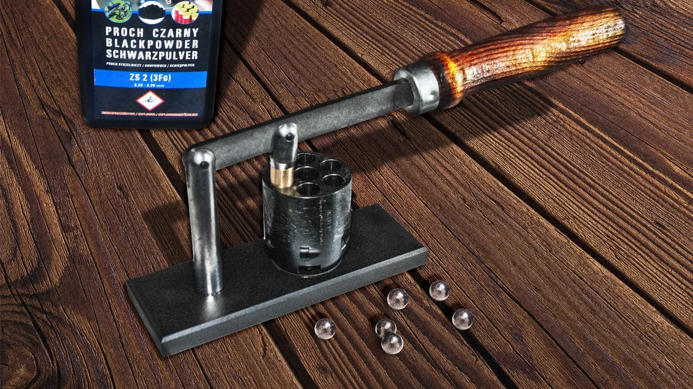 Uniwersalna prasa przeznaczona do bezpiecznego i szybkiego ładowania bębna rewolwerowego.
