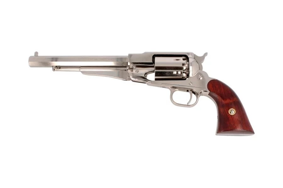 1858 Remington Texas Nickel .44, sześciostrzałowy kapiszonowy rewolwer czarnoprochowy w kalibrze .44 w wersji niklowanej.