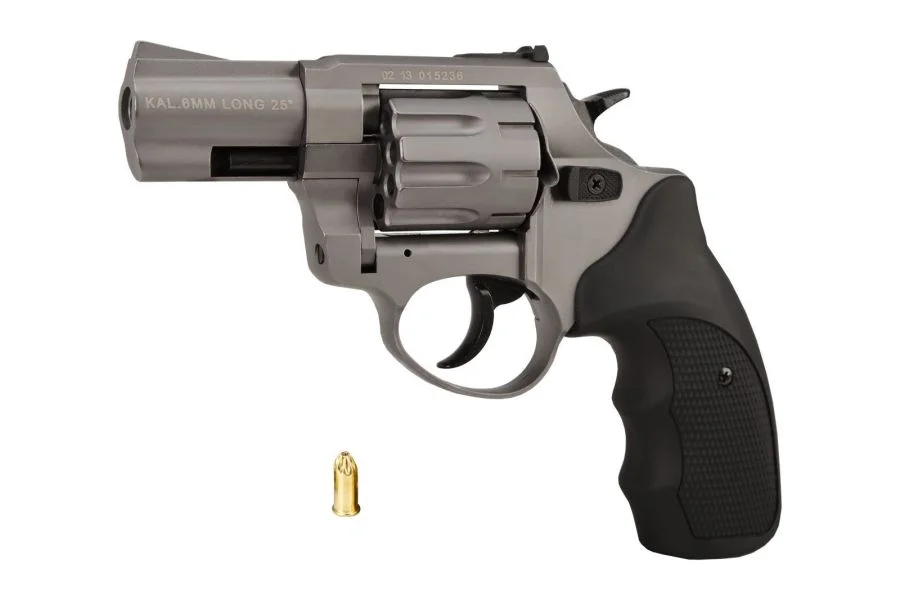 Rewolwer alarmowy ZORAKI R1 mod. K6L BAS to rewolwer alarmowo sygnałowy strzelający przedłużonym nabojem hukowym .22 Long Blank / 6mm Long, dającym mocniejszy huk niż standardowe kapiszony 6mm short.