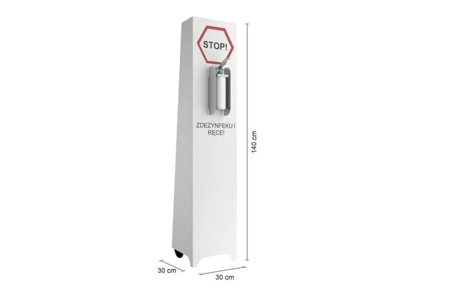 Stand, stojak z dozownikiem łokciowym na płyn dezynfekujący do rąk, wolnostojący.