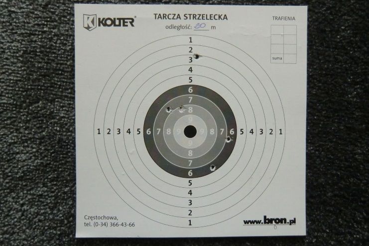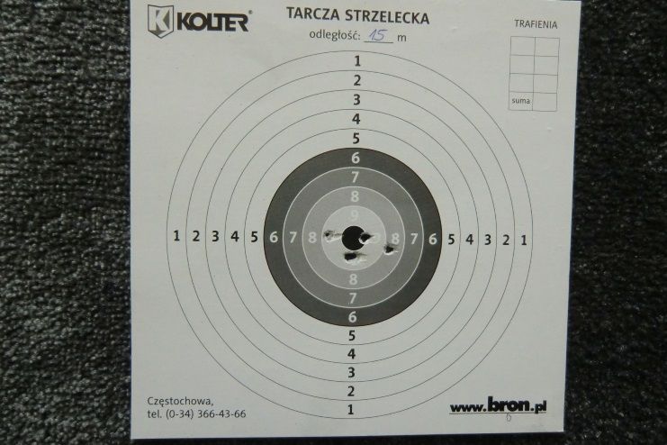 Jak widać na dołączonych tarczach jest się czym pochwalić! Przestrzeliny uzyskane z dystansu 15 metrów są wręcz wzorowe! Najgorsza punktacja to 9-tka! Na dalszych dystansach jest oczywiście coraz słabiej, co nie znaczy źle. Tak przecież musi być ze wzrostem odległości. A nawet z 30 m najgorszy wynik, jaki uzyskałem to 3-ka, więc chyba nie ma się czym martwić. A pamiętajcie, że cały czas strzelanie odbywało się przy pomocy muszki i szczerbinki. Gdyby zamontować lunetę, to na pewno zdołałbym poprawić wyniki na dalszych dystansach. Tego jestem pewien!