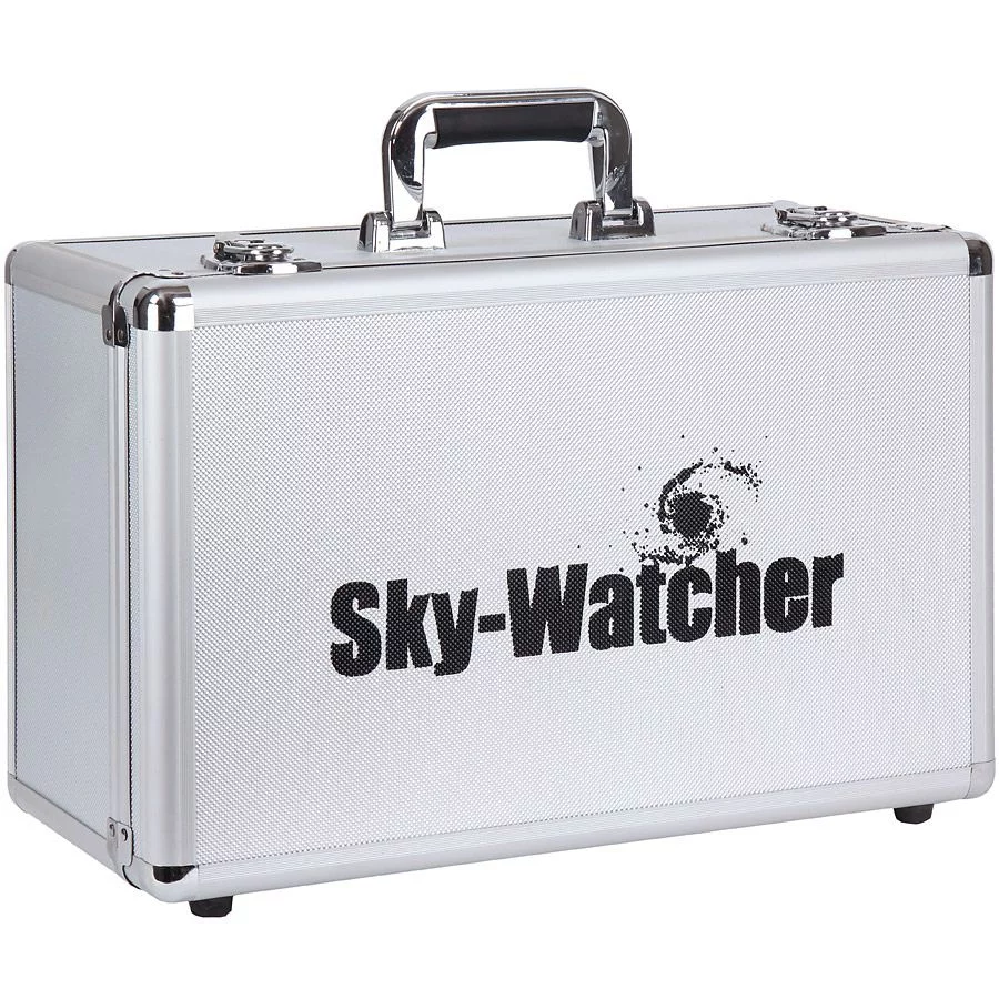 Solidna, wysokiej jakości walizka aluminiowa na wszystkie wersje montażu Sky-Watcher EQ3. Wewnątrz skrzyni znajduje się odpowiednio wytłoczona gąbka, zabezpieczająca montaż podczas transportu. Wszystkie krawędzie skrzyni są wzmocnione stalowymi wykończeniami. Wygodna rączka i zatrzaskowy system zamykania wraz z zestawem dwóch kluczy to gwarancja bezpiecznego przewożenia montażu. Bardzo estetyczne, teksturowane aluminium, którym wykończona jest powierzchnia zewnętrzna walizki ma naniesione logo producenta. Nóżki i dodatkowe odbojniki umieszczone na spodzie i dolnej powierzchni walizy chronią jej powierzchnie przed zabrudzeniem i porysowaniem od podłoża. Waliza idealnie sprawdza się w transporcie samochodem, samolotem lub po prostu do wygodnego przenoszenia montażu od domu do stanowiska obserwacyjnego. Metalowa konstrukcja to gwarancja długoletniej, bezproblemowej eksploatacji.
