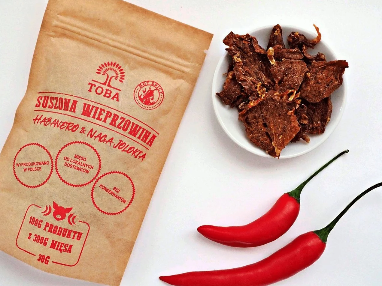Wieprzowina suszona Toba habanero 30 g to smaczna przekąska, wyprodukowana z 300 g wysokiej jakości surowej wieprzowiny na 100 g produktu.