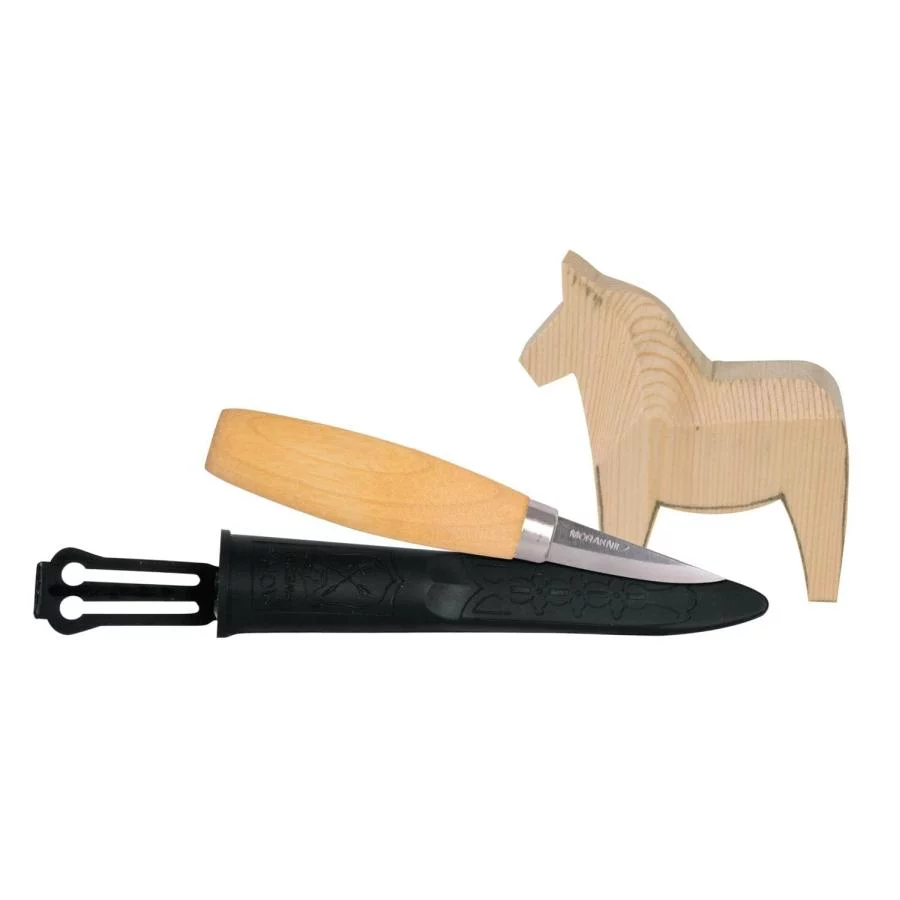Zestaw do rzeźbienia w drewnie zawierający klasyczny nóż Mora Wood Carving 120 z ostrzem ze stali laminowanej i plastikowym pudełkiem z zaczepem na pasek. Idealny do pierwszych kroków w rzeźbiarstwie.