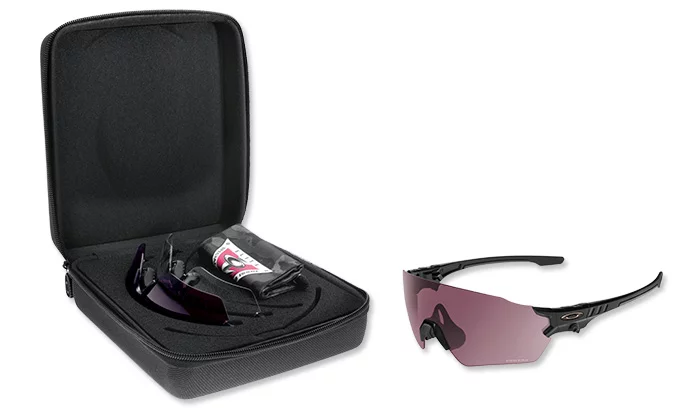 - Wysokiej jakości sztywne etui z montowaną na rzep naszywką Oakley Tombstone. Etui umożliwia przenoszenie wraz z okularami do trzech sztuk zamiennych wizjerów.